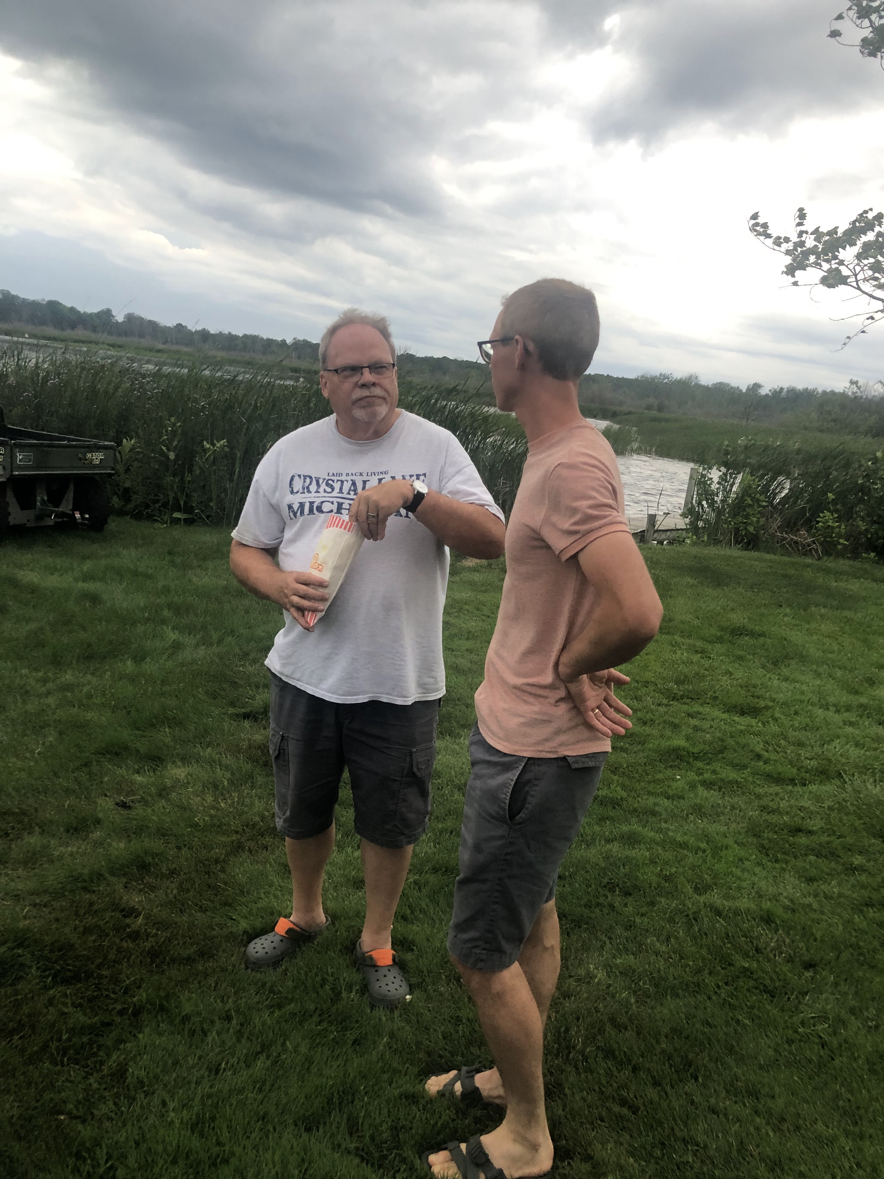 We dilly-dallied in the land of Yep (Is everything OK? "YEP", Yoose ("YOOSE guys have a nice day now."), and Yooper (That's what we call ourselves around here) until about seven this morning. Then we walked to B's Country Cafe for breakfast. Because of the light drizzle we wore our raincoats. Because of the promise of torrential rain, we carried the umbrella. The rain did not disappoint. We walked back nicely soaked, and drove all day through the driving rain. While visibility was poor, the drive itself was uneventful. We arrived safely at Little Eden Camp around 4:45. Most of the crew was already engaged in unpacking the cars. I helped Kel Babe launch his boat, squared things away in our cabin (The Mosey Inn). For dinner, we went into town for Mexican food, and by the time we got back the kettle corn was popping down by the water in the cauldron powered by a roaring wood fire. The well trained campers lined up for a bag of the sweet treat, and everyone reacquainted themselves for another great family week. Fortunately, the rain held off for most of the evening, but the leading edge of the next storm ruffled the lake with white caps. There's promise of rain all night with the weather clearing beginning tomorrow. The spirit here is joyful. Lots of dads, moms, kids, and grandparents. Everyone seems glad to be here, and why not. Life here is surely good, especially today.